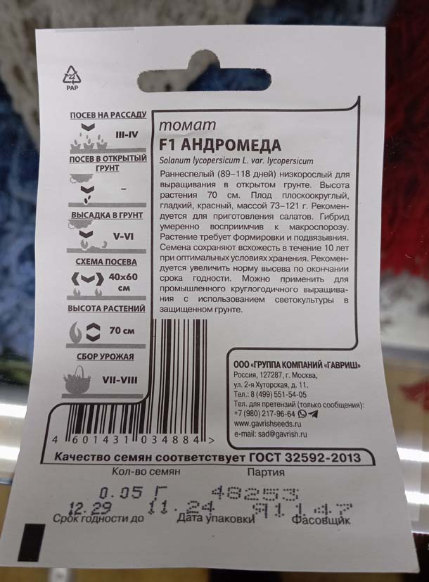 Раннеспелый, низкорослый, для открытого грунта. Белый пакет.